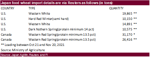 Japan seeks 113,067 tons of food wheat from the US and Canada, this week for October 21-November 20 loading.