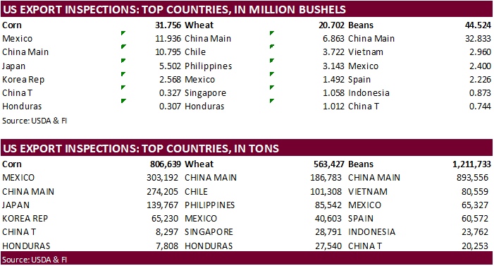 US corn export inspections as of September 24, 2020 were 806,639 tons, within a range of trade expectations, above 765,589 tons previous week and compares to 421,735 tons year ago. Major countries included Mexico for 303,192 tons, China Main for 274,205 tons,