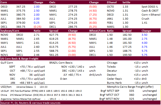 opened lower despite a lower USD. Selling started to dry up around 9:30 am and at 9:41 CT, 3,400 December corn contracts traded, and prices traded around unchanged. Prices increased following wheat and good export developments. December corn only ended