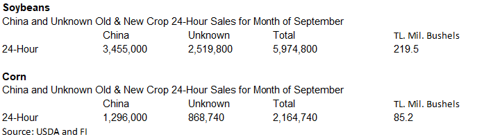 1.50 cents higher and March was up 2.25 cents. USDA posted corn sales to Japan and unknown destinations. Producers were busy selling soybeans but not so much for corn. China imported 5.59MMT of corn and 64.730 million tons of soybeans during Jan and Aug.