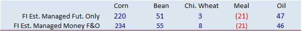 Funds sold an estimated net 5,000 soybeans, 1,000 meal and 3,000 soybean oil.