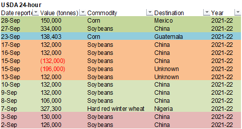 the 24-hour reporting system, private exporters sold 150,000 tons of corn to Mexico for 2021-22 delivery.