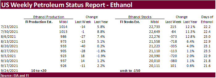 A Bloomberg poll looks for weekly US ethanol production to be up 13,000 barrels (920-953 range) from the previous week and stocks up 84,000 barrels to 20.195 million.