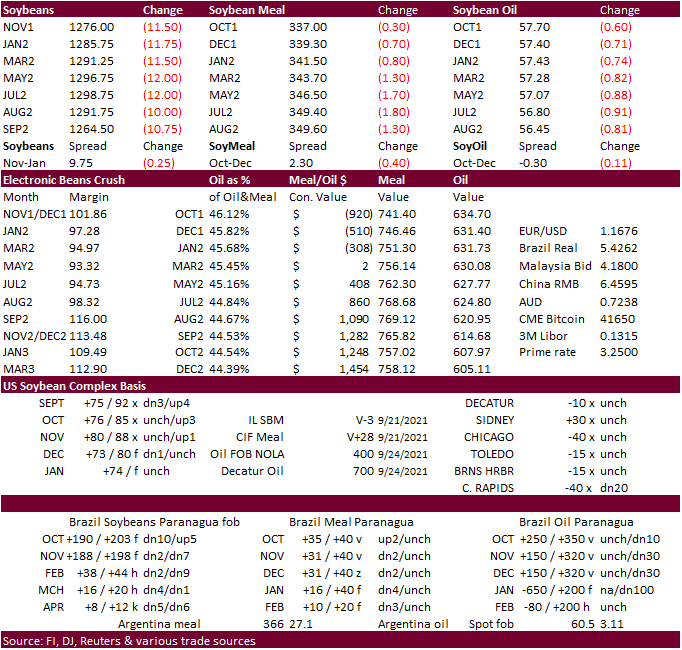 Soybeans, meal, and soybean oil were weaker on a higher trade in the USD, reversal in WTI crude oil, lack of fresh news, and weakness in China soybeans. Soybean oil traded two-sided and was heavily influenced by WTI crude. Ironically