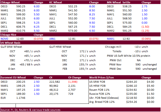 corn traded sharply higher on strength in soybeans and concerns SA plantings (soybeans) are running behind normal for this time of year. December corn was up 5.50 cents and March up 5.00 cents.