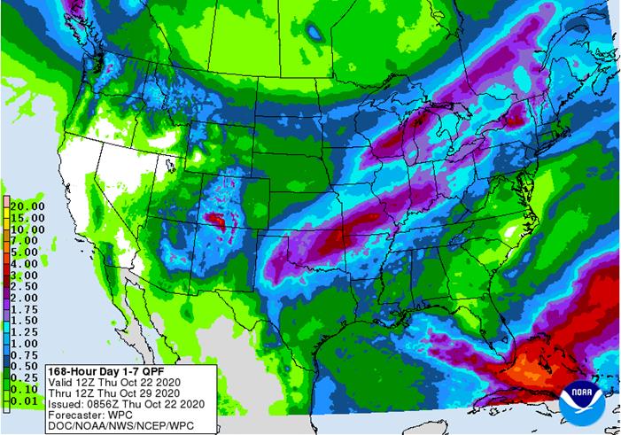 America will be wetter than usual over the next ten days to two weeks keeping late season crop maturation and harvest progress slow, but the moisture is improving long term water supply.