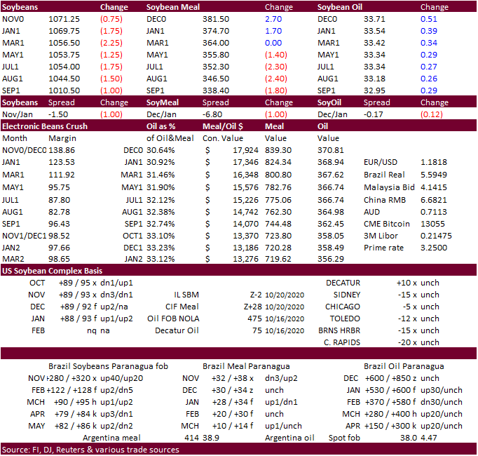 Exports for Own Account: For 2020/2021, the current exports for own account outstanding balance is 7,300 MT, all Canada. Export Adjustments: Accumulated export of soybeans to the Netherland were adjusted down 56,666 MT for week ending October 1st