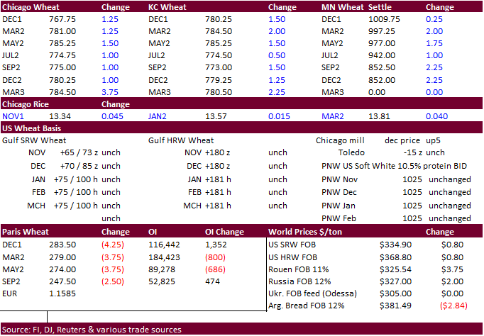 US wheat started mixed then traded higher, in part from a lower USD. Positioning ahead of the USDA report was noted. The CFTC report showed longs holding a good position for the KC and MN markets. December soft wheat ended 1.50