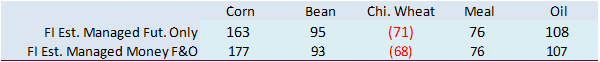 Funds bought an estimated net 9,000 soybeans, bought 4,000 meal and bought 5,000 soybean oil.