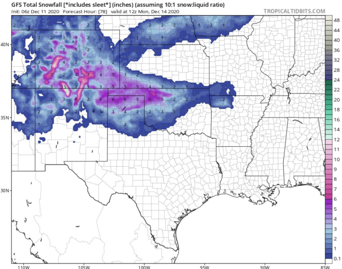 storm will produce 2 to 6 inches of snow with local totals to 8 inches from southeastern Colorado into Oklahoma and southwestern Kansas as well as the northeast half of the Texas Panhandle - Rain