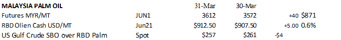 CBOT soybean complex was higher this morning on technical buying and to a lesser extent a slightly weaker USD and near unchanged WTI crude oil. SK bought SA soybean meal. Palm oil traded 40 points higher (good exports during late March) overnight and cash