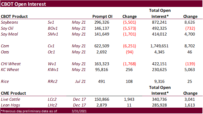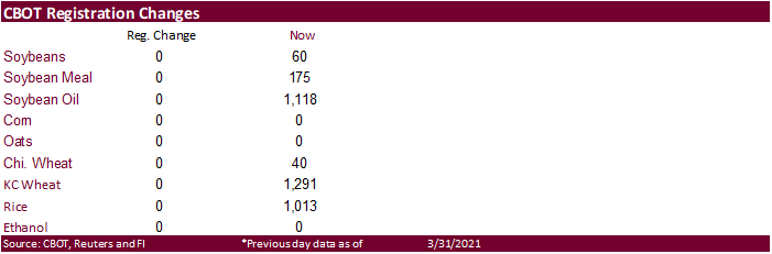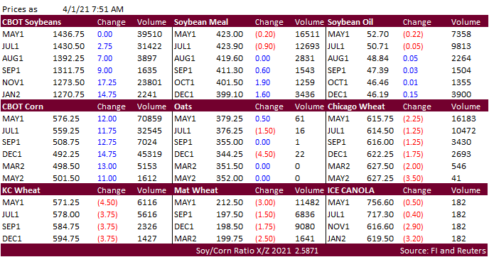 - Bear spreading in nearby soybeans, meal and soybean oil created a late overnight session two-sided trade. Poor export sales for the soybean complex may keep May contracts on the defensive. New crop continues to be supported by a smaller than expected US soybean planted area. Look for a choppy trade on fund positioning. Today marks a new month and new quarter.