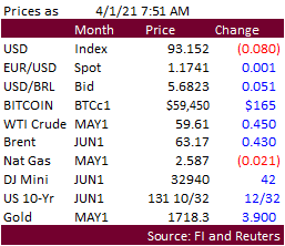 - CBOT is higher on follow through buying post bullish USDA Prospective Plantings report but gain may be capped from positioning ahead of the long holiday weekend and profit taking. Nearby rolling prices hit their highest level since 2013. May gapped higher ($5.72 last absolute high early Feb.) and $6.00 is not out of reach, but in order to see that occur US corn inspections need to improve.