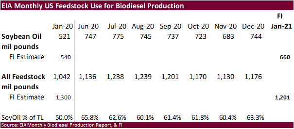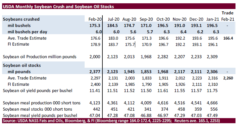 US export sales for the soybean complex came in on the light side for all three commodities. Soybean sales of 105,800 tons old crop included 124,000 tons for China (66k switched from unknown). New crop soybean sales were 131,000 tons. USDA soybean shipments were a marketing year low of 460,900 tons. Soybean meal shipments were good at 257,400 tons and SBO shipments were 10,700 tons (down from 13,200 tons previous week). Corn export sales were 797,300 tons old-crop, lower end of trade expectations (no China). All-wheat sales of 250,100 tons for 2020-21 were within expectations but new-crop was light at 81,000 tons. The wheat sales include China switching 130,000 tons from unknown. Pork sales were a large 61,000 tons-a marketing year high. Sorghum sales of 121,000 tons were good and included China for 176,000 tons (55k switched from unknown) & decreases for unknown.