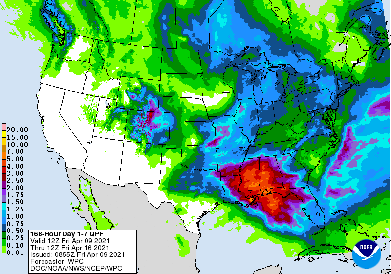 weather is looking relatively good for early season planting with rain this week helping to ensure good soil moisture for aggressive planting later this month. Field progress will not advance very well during the next ten days in some of the wetter areas,