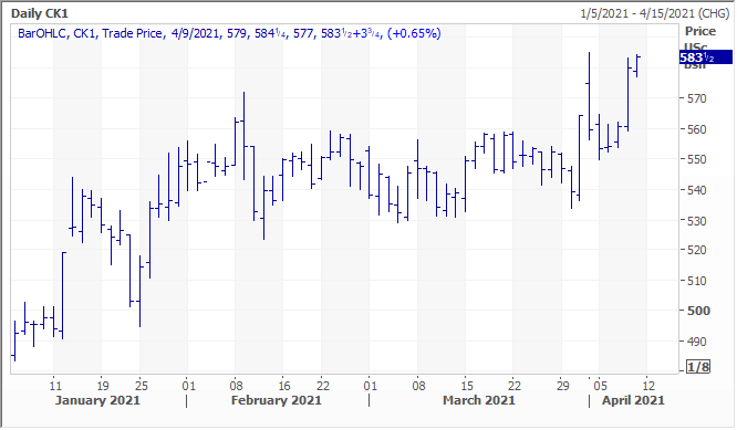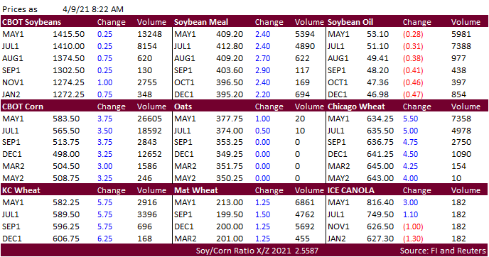higher on follow through buying ahead of the USDA report. Overnight news was very quiet. May corn is near its contract high.