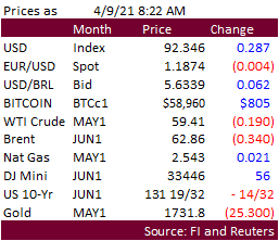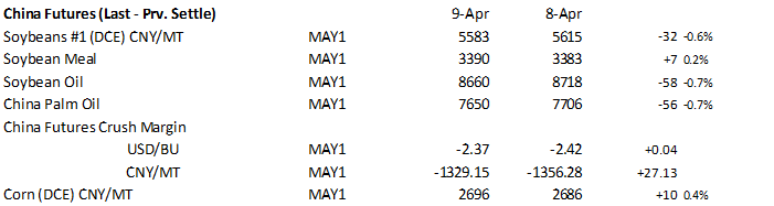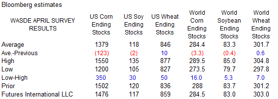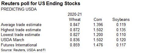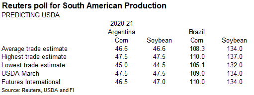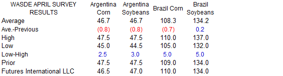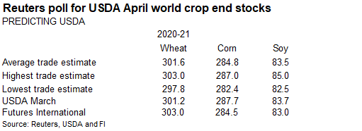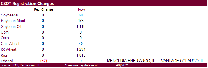 Reuters poll for Malaysia’s palm oil inventories shows March stocks expected to rise 1.3% from February to 1.32 million tons, production to slightly decline, and exports to be up 25% to 1.12 million tons. The Malaysian Palm Oil Board will release the official