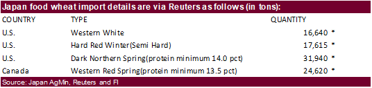 - Japan in its weekly SGS import tender seeks 80,000 tons of feed wheat and 100,000 tons of barley for arrival