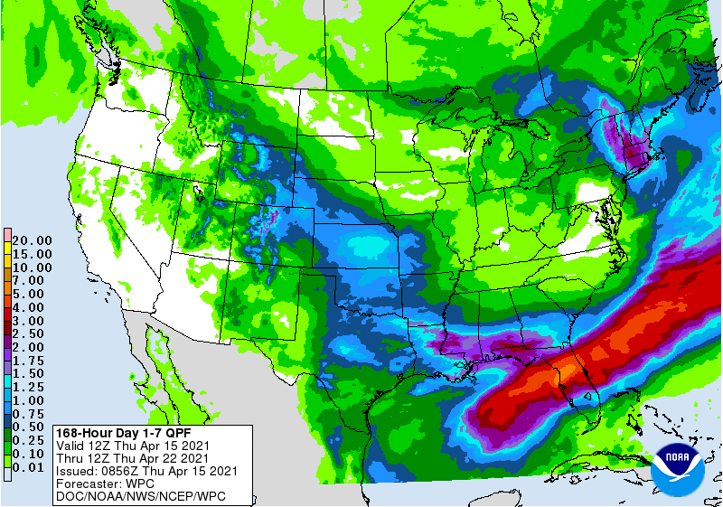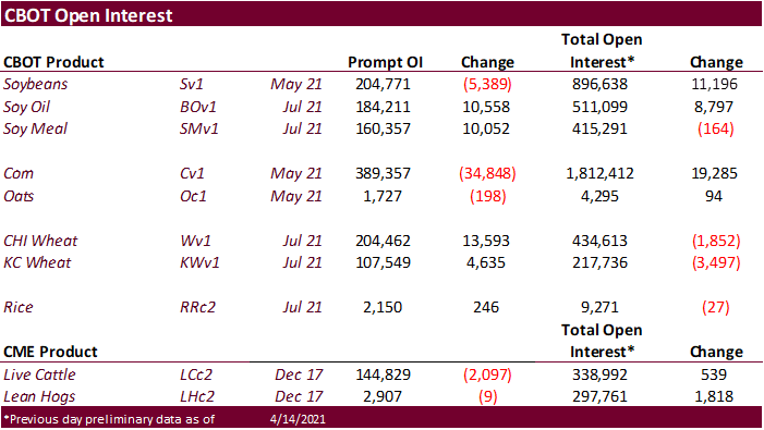 USDA Broiler Report showed eggs set in the US up 7 percent and chicks placed up slightly. Cumulative placements from the week ending January 9, 2021 through April 10, 2021 for the United States were 2.61 billion. Cumulative placements were down 2 percent
