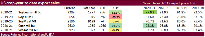 sales for old crop were above water at 90,500 tons and new-crop within expectations at 265,500 tons. Meal and soybean oil sales were at the low end and below expectations, respectively.
