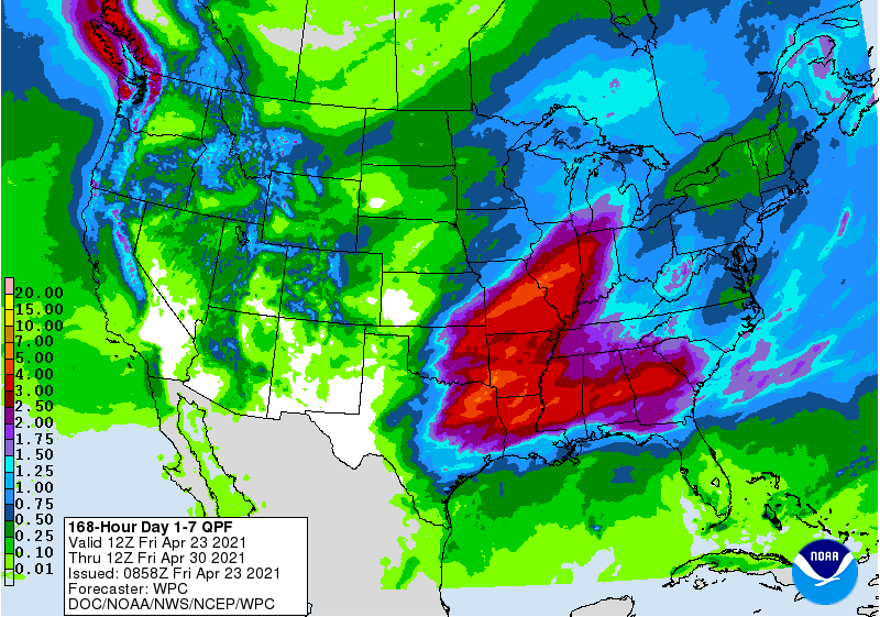 rainfall is expected during mid-week next week in the central Midwest and Delta, but good field working conditions will precede the event and sometime of improved field conditions will follow before the next rain event comes along -