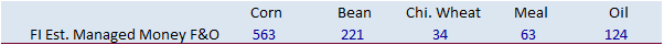 were lower with exception of MN. Most of the losses overnight were paired by a 42-point decline in the USD and ongoing crop concerns.
