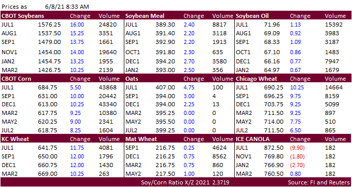 values are leading soybean oil 7 points higher and meal $1.60 higher. -