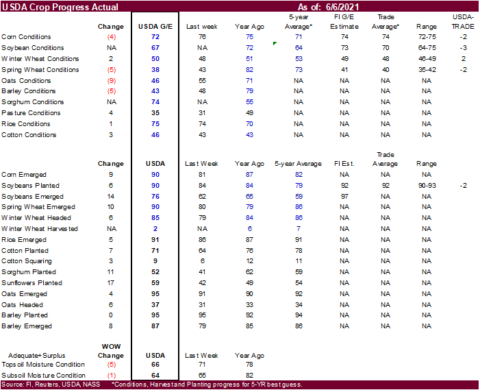 corn conditions were reported 2 points below expectations at 72 percent, down 4 points from the previous week, below 75 year ago and above 71 percent average. 90 percent of the corn crop is emerged.