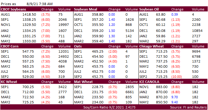 soybean complex is mixed with most soybean positions lower after China reported a decline in July soybean arrivals from a year ago and Covid-19 concerns. Sharply lower WTI crude oil is pressuring soybean oil. Meal is higher on unwinding of product spreads.