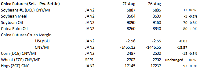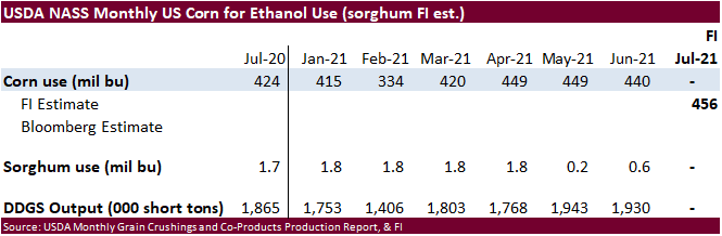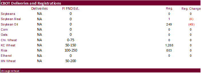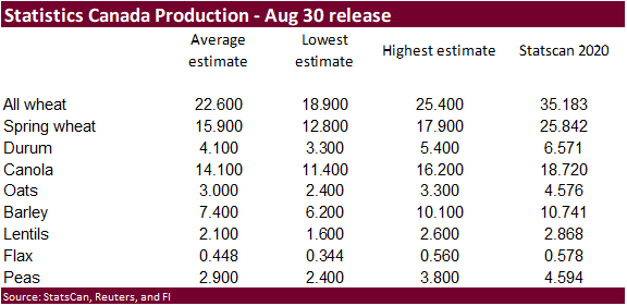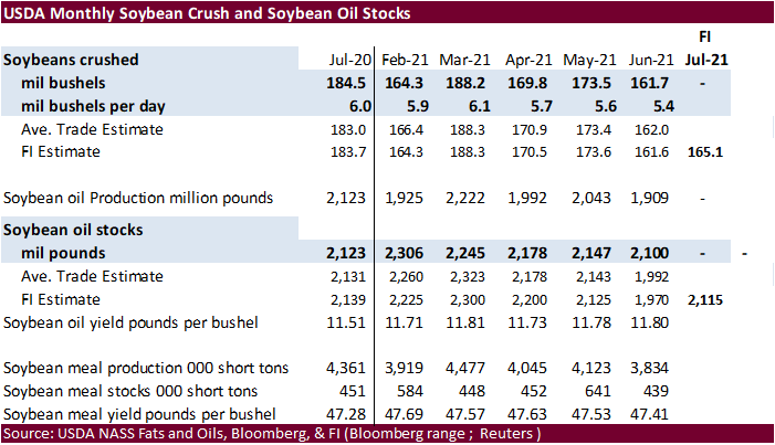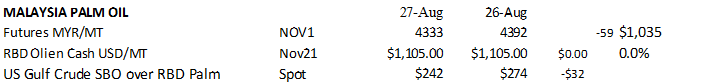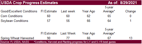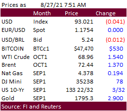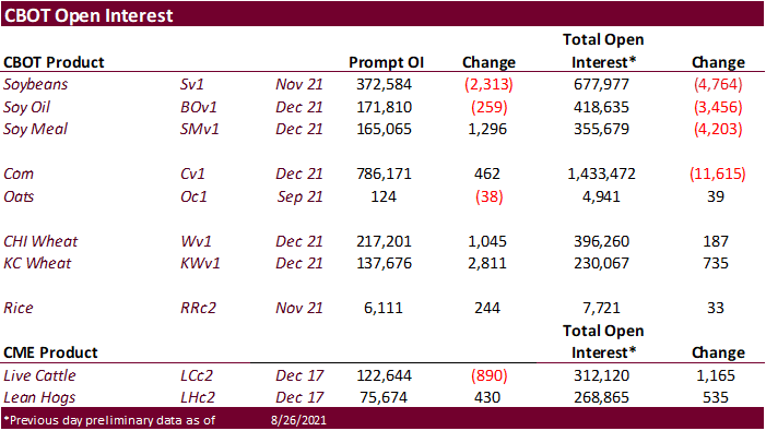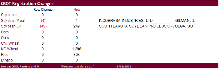 FI Morning Grain Comments 08/27/21 Aug 27, 2021 PDF attached Good morning. Soybean complex is under pressure led by soybean oil in part to uncertainty over US biofuel 2021 and 2022 mandates. New-crop corn is under pressure from a weather forecast calling for rain across the upper western Corn Belt. September FND deliveries are Monday and today we are seeing some short squeezing. Wheat is mixed on lack of direction. WTI is higher USD weaker, gold higher and US equities higher.