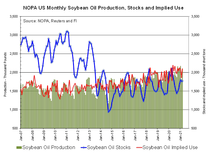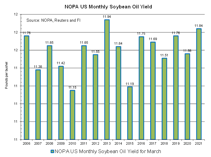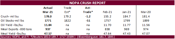 NOPA March US crush report was slightly bearish for soybeans and a little friendly for the products. NOPA reported a March crush at 178.0 million bushels, 1.2 million below a Reuters trade average but below 181.4 million reported a year ago. Daily adjusted the crush increased only 3.6% from February and was down 1.9% from March 2020. The daily crush also ranks 6th largest in our working history. US soybean oil stocks came in at 1.771 billion pounds, 51 million below an average trade guess and well up from 11.70 pounds per bushel from February and below 1.899 billion reported a year earlier.