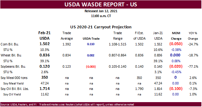 World corn stocks up 2.7MMT and soybeans down 1.0MMT.