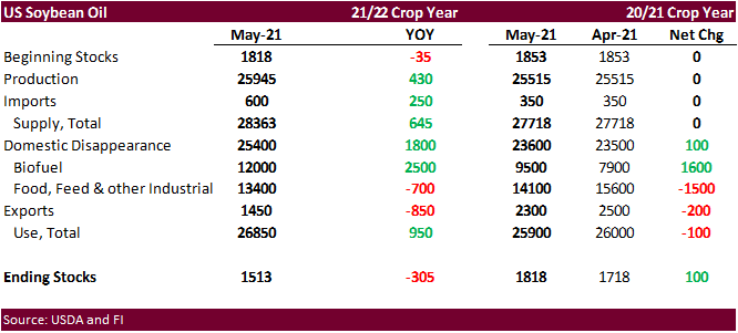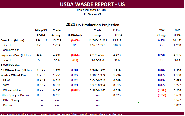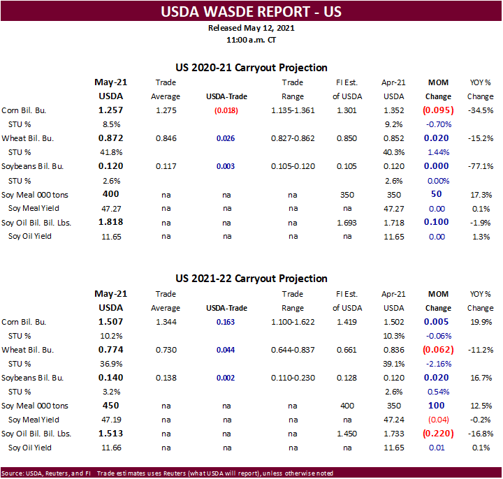 Old crop wheat US ending stocks were above expectations, 2020-21 US soybeans near expectations and 2020-21 US corn below expectations.