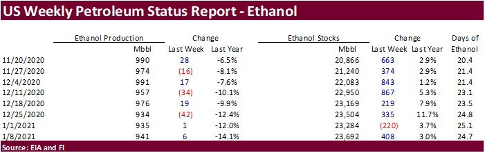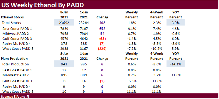 US weekly ethanol production increased 6,000 barrels per day to 941,000 barrels, highest level in a month, and stocks were up 408,000 barrels to 23.692 million barrels, highest level since May 8, 2020. A Bloomberg poll looked for weekly US ethanol production to be unchanged and stocks up 244,000 barrels. September to Jan 8 ethanol production is running 7.5% below the same period a year ago. US gasoline demand decreased 91,000 barrels to 7.532 million, but down 12 percent from this time last year.