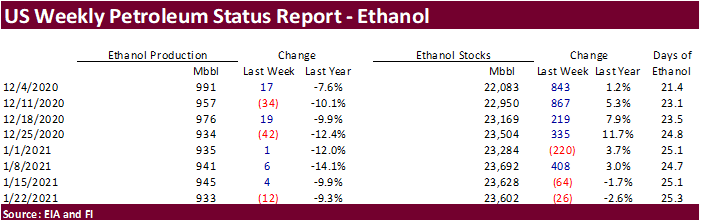 Weekly ethanol production declined by 12,000 barrels to 933,000, about in line with a Bloomberg survey. Stocks decreased 26,000 barrels to 23.602 million, an indication use is picking up a tad this month. However, net blender input of ethanol into finished motor gasoline tumbled over the week ending Jan 22. Early September to date ethanol production is running 8 percent below same period a year ago.