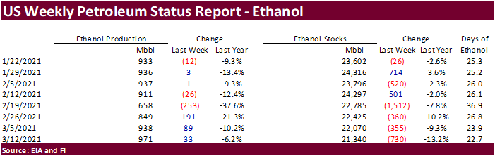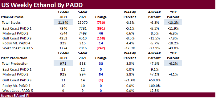 Weekly US ethanol production increased a more than expected 33,000 barrels (BB estimate up 8,000) from the previous week to 971,000 barrels, and stocks declined a large 730,000 barrels to 21.340 million. Production was highest since December 18 and stocks lowest since November 27. Stocks are down nearly 3 million barrels over the past four weeks. Early September through March 12 US ethanol production is running 10.1 percent below the same period a year ago. Gasoline product supplied (demand) was 8.442 million barrels, down 284,000 from the previous week and nearly 13 percent below this time last year. Total ethanol blended into finished motor gasoline was 8.306 million barrels, 91 percent blend rate of finished motor gasoline produced.