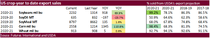 Sorghum: For 2020/2021, net sales of 60,800 MT were primarily for China (60,500 MT). Exports of 71,000 MT were down 80 percent from the previous week and 53 percent from the prior 4-week average. The destination was primarily to China.