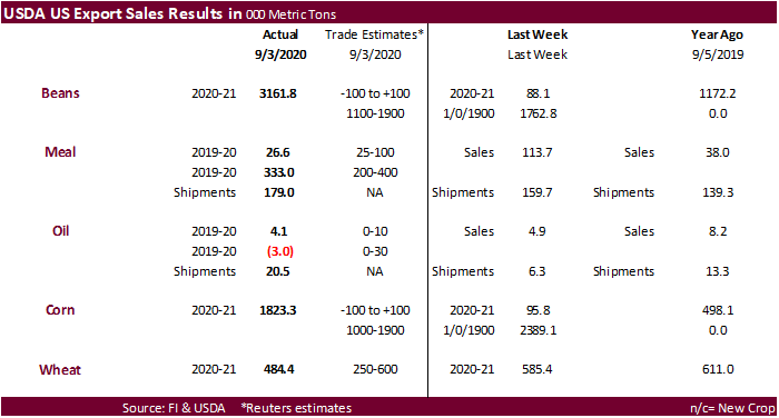 U.S. EXPORT SALES FOR WEEK ENDING 9/3/2020