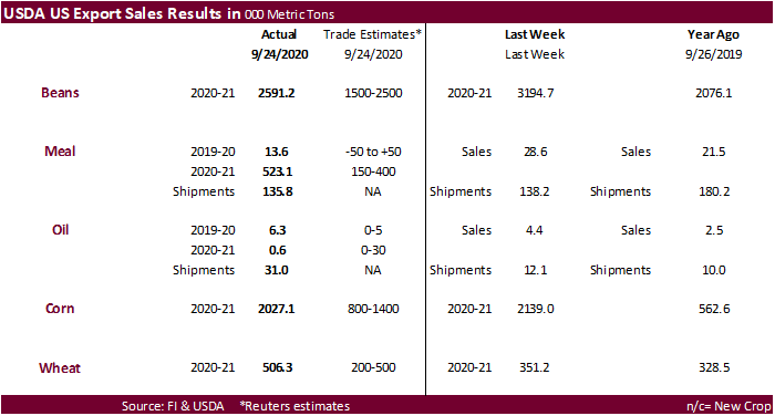 U.S. EXPORT SALES FOR WEEK ENDING 9/24/2020