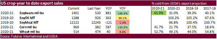USDA export sales proved to be robust again for soybeans, corn and new-crop meal. Soybean oil shipment were good. All-wheat sales slightly topped expectations. The report was seen supportive all around.
