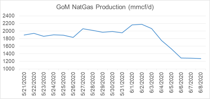 The Bureau of Safety and Environment Enforcement (BSEE.org) reported 185 platforms were evacuated in the GoM. This knocked out 34% of offshore oil production (0.635 mmbbl/d) and 32% of offshore natural gas production (879 mmcf/d). We expect production to resume quickly this week.