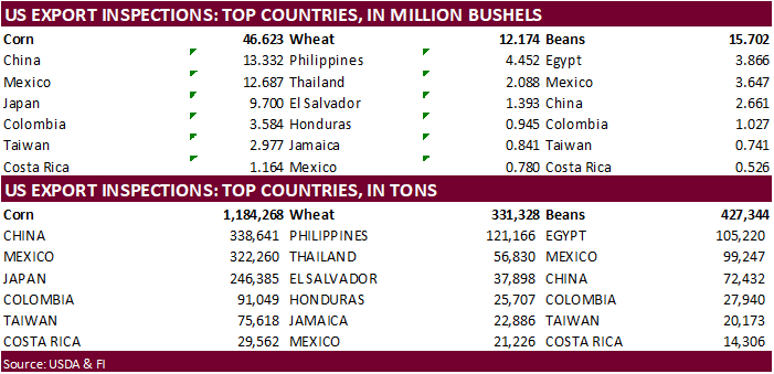 USDA US soybean export inspections as of June 16, 2022 were 427,344 tons, within a range of trade expectations, below 608,116 tons previous week and compares to 205,645 tons year ago. Major countries included Egypt for 105,220 tons, Mexico for 99,247 tons, and China for 72,432 tons.
