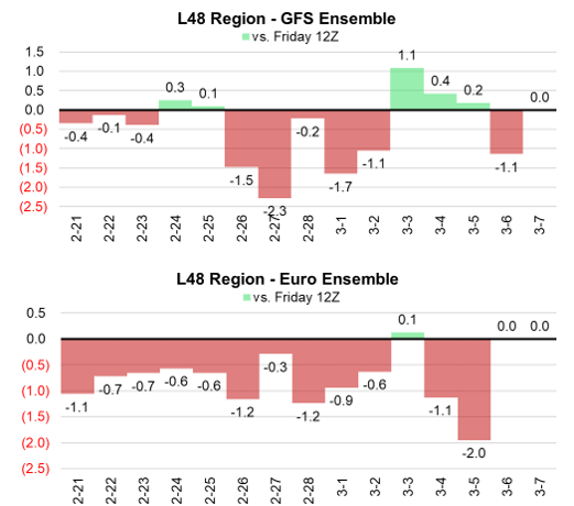 Here are the changes in the GFS Ensemble and Euro Ensemble since the Friday 12z run. Both showing a bearish trend. [GFS Ensemble: -7 GWHDDS, Euro Ensemble: -11 GWHDDS]