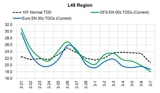 Fundamentals for the week ending Feb 19: The last week report of -237 Bcf finally got us below last year’s levels. We now sit at a -105 Bcf to last year. Our early view for the upcoming storage report is a -320 Bcf withdrawal for the lower 48. This would take storage levels to 1961 Bcf (-280 YoY, -143 vs 5Yr). The industry estimates for this report range between -365 to -291 according to The Desk. This week’s report is going to be one of the most interesting numbers on record, as it will give us more clarity into the events from last week.