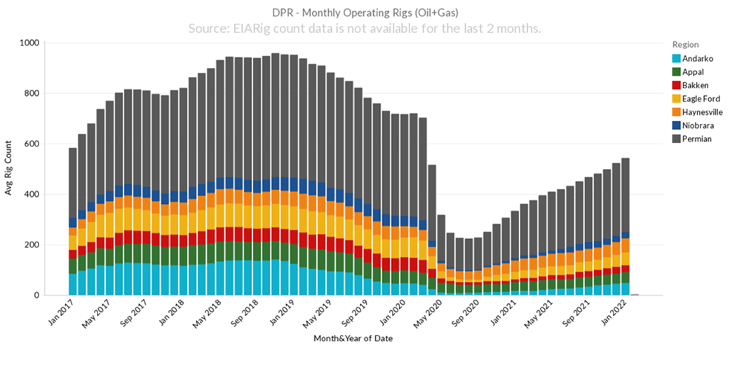 The growth is occurring amid increasing drilling activity and spending hikes with front-month crude oil futures trading above $100/b. That being said, the short-term production gains would still heavily rely on DUCs. The chart below clearly shows that there is a gap between monthly completed wells and drilled well. This reliance on DUCs started with the onset of COVID and dropping energy prices. In Oct 2020, drilled well made up only 52% of total completed wells. Today with increasing energy prices, producers are starting to deploy rigs (but only to specific regions) and drill at a faster rate. Today, that number has trended up to 82% of completed wells being drilled.