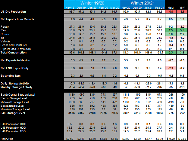 For this weekend’s report, we take a look at the latest monthly supply and demand figures from the EIA. This data is most interesting because it covers the cold period during February and we can now see how each line item of the natural gas balance was impacted by the severe cold episode in that month.